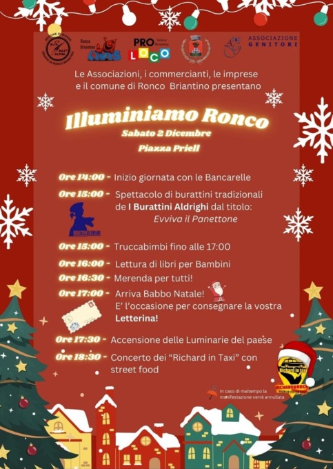 Sabato 2 dicembre “Illuminiamo Ronco”. Dalle 14 alle 18.30 un pomeriggio di festa e animazione in piazza Priell a cura del Comune, delle associazioni e dei commercianti. Bancarelle e spettacoli, poi alle 17 l’arrivo di Babbo Natale e, a seguire, la cerimonia di accensione delle luminarie in paese.