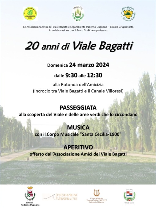 A Nova Milanese 20 anni fa il Viale Bagatti veniva finalmente riportato al suo antico aspetto, con la riqualificazione dei percorsi e dei filari che accompagnano il camminatore dalla città di Paderno Dugnano alla bellissima villa Bagatti-Valsecchi di Varedo. Domenica 24 marzo l’Amministrazione comunale celebra questa ricorrenza con una passeggiata alla scoperta del Viale e delle belle aree verdi che lo circondano, accompagnati dalle associazioni Amici del Viale, Legambiente Paderno e dal Parco GruBrìa.