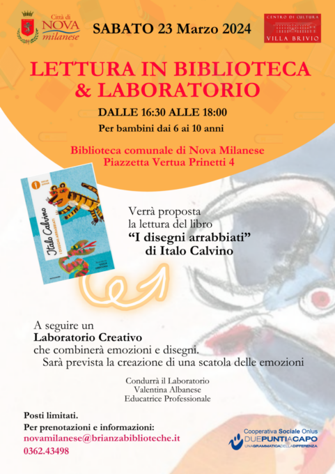 Sempre a Nova Milanese, Sabato 23 marzo, alle ore 16.30, la cooperativa sociale Duepuntiacapo organizza in biblioteca la lettura del libro ‘I disegni arrabbiati’ di Italo Calvino, dedicata ai bambini dai 6 ai 10 anni. A seguire un laboratorio creativo che combinerà emozioni e disegni, dove si realizzerà insieme una scatola delle emozioni!