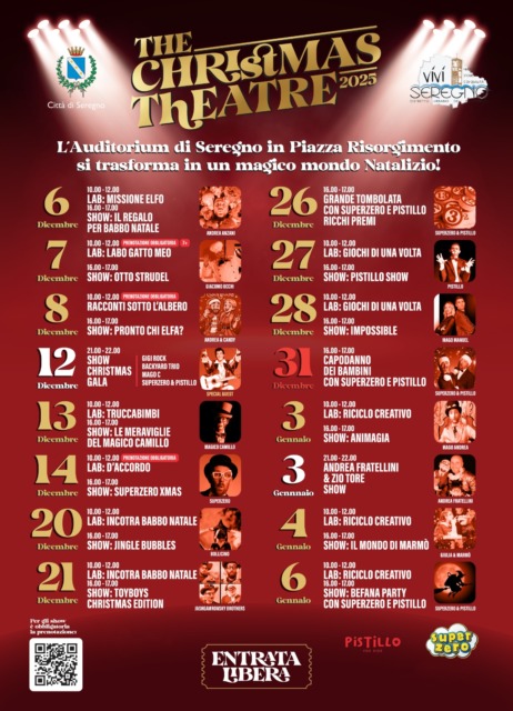 Ne l’Auditorium di Piazza Risorgimento a Seregno quest’anno a ospitare gli eventi dedicati ai più piccoli, trasformandosi in The Christmas Theatre, un palco che dal 6 dicembre al 6 gennaio ospiterà spettacoli, laboratori creativi, letture animate e show per bambini.