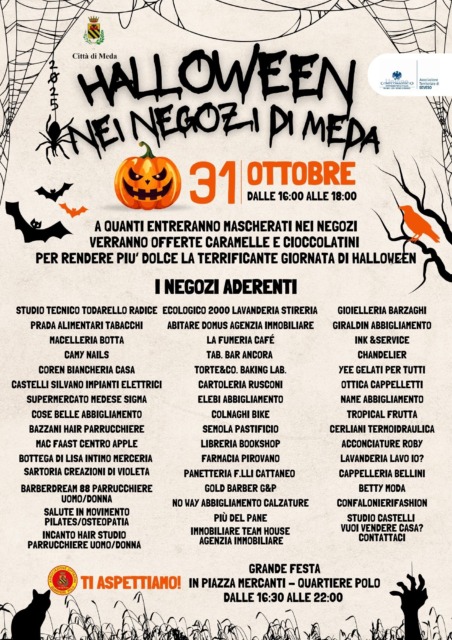 Venerdì 31 ottobre, dalle 16:00 alle 18:00, a quanti entreranno mascherati nei negozi verranno offerte caramelle e cioccolatini per rendere piu’ dolce la terrificante giornata di Halloween negozi aderenti nella locandina allegata:
