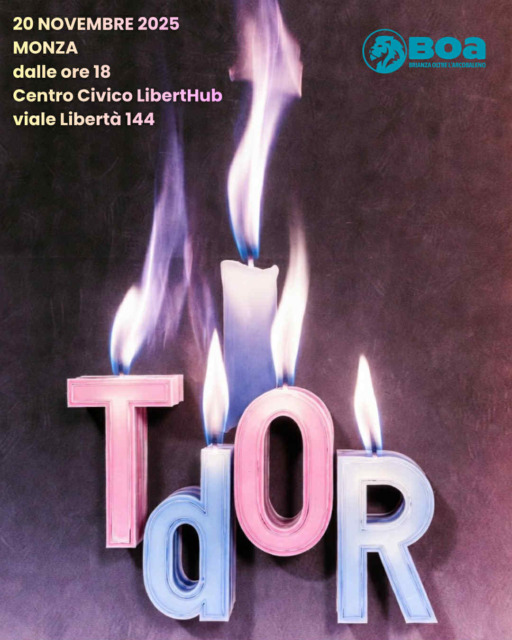 Presso il Centro Civico Libertà (Viale Libertà 144, Monza), sede del “Punto Arcobaleno” nato lo scorso giugno, si terrà una vegli a lume di candela. Per ogni vittima dell’ultimo anno verrà accesa una candelina, mentre verranno pronunciati nomi, cognomi e provenienza. Saranno presenti le attiviste e gli attivisti di Brianza Oltre l’Arcobaleno, e sono stati invitati i consiglieri del Comune di Monza e i consiglieri provinciali della Provincia di Monza e Brianza.