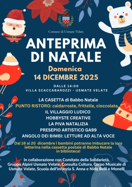 Domenica 14 dicembre, dalle 14 alle 17.30,  la piazza di Villa Scaccabarozzi si animerà con l’iniziativa “Anteprima di Natale”, promossa dal Comune di Usmate Velate in stretta collaborazione con Consulta Cultura, Comitato della Solidarietà, Gruppo Alpini Usmate Velate e Corpo Musicale Usmate Velate.